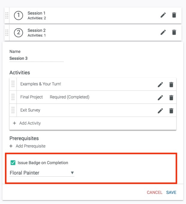 For students to obtain badges, make sure you’ve first created Modules for your Micro-course. Go to the Modules tab in the Navigation Bar, then click the edit icon to find the Issue Badge on Completion option as seen in the image below. You will see options from the badges you’ve initially created, select one, then click Save.